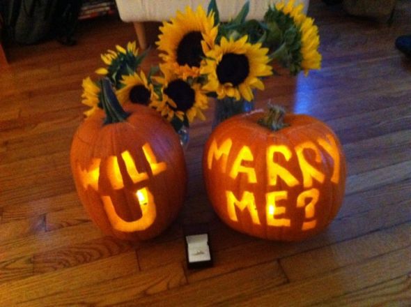 Imagine leading her in to a dimly lit romantic dinner, the scent of warm cider filling the air. What greets her is this beautiful display, lovingly carved into a jack-o-lantern of her dreams. This girl who posted on the WeddingBee message board definitely said “YES!”