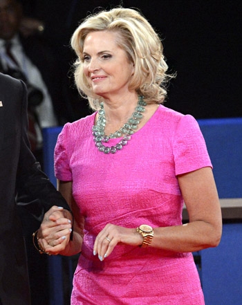 Ann Romney wears a classic eternity wedding band. Apparently, Mitt proposed to her after only two months of dating, when they were teenagers! (Well, he didn’t really had a ring for her at this point.) She said yes but they waited a few years and Mitt proposed again, with a ring this time!