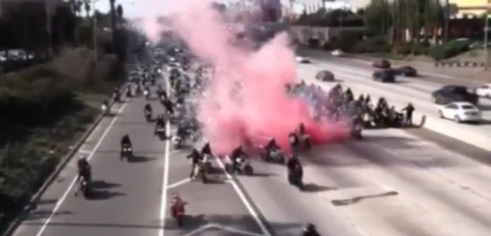 You see, hundreds of bikers helped stop traffic on a California freeway so the groom-to-be biker could emit a plume of pink smoke from his bike before proposing to his girlfriend. Turns out, stopping traffic when it’s not an emergency is actually against the law so some of the participants may be facing criminal charges.