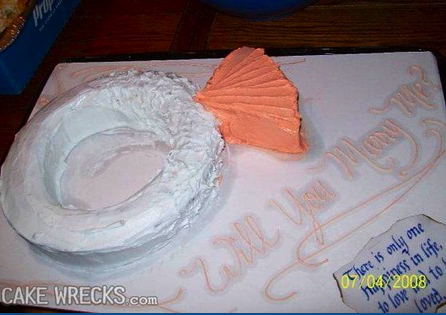 Beware of some store bought cakes. According to CakeWrecks.com, this is a proposal fail. What's with the color of that diamond anyway?