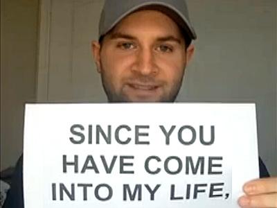 This man comes up with a great message about how much he loves his boyfriend who he has been with for over five years. The video is set to music while he brings up each sign, one at a time.