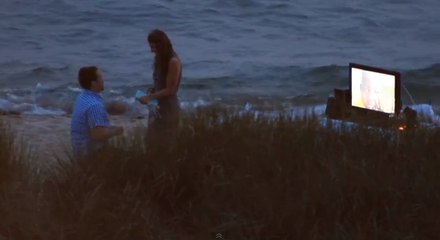 As if the LipDub wasn’t enough, Emily is lead to the beach at the end of the show. There she follows a trail of letters and notes written for her. These notes contain favorite memories, things he loves about her, etc. At the very end there’s a screen set up with a video from friends and family about how wonderful Emily is, and how wonderful she and Brad are together. It ends with one of her students telling her that Brad is going to put a ring on her finger, and she should say yes.