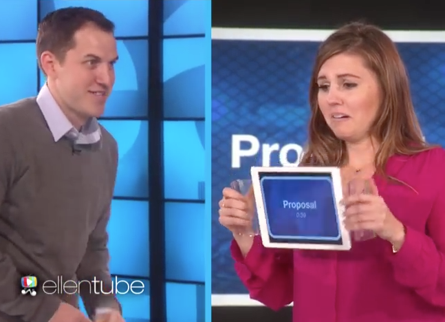 Ellen asks the couple to play a round of “Heads Up,” which is essentially a fancy way to play charades. The first few words are easy (1:55), but when the screen says “Proposal” Jessie is beyond excited– her reaction is immediate, to the point that Johnny didn’t even get to actually ask the words (2:15).