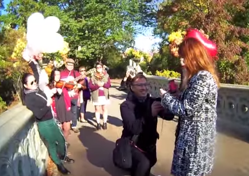 Oscar enlisted the help of plenty of accomplices. He chose Bow Bridge as the spot because it’s the second oldest bridge in the park, and he uses the spot well. He tells her he wants to continue to build brigdes wit hher, and like Bow Bridge– their love is time tested. Plus, Bow Bridge has been the spot in several NYC movies– such as The Way We Were.