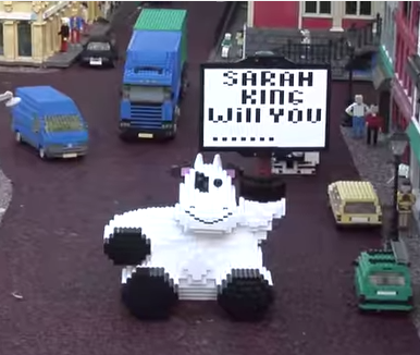 Sarah and Sam have been together for 6.5 years, and Sam has decided it’s about time that he proposes. He decides to put his Lego designs to the test and creates a cow holding a sign that says, “Sarah King Will You …..”