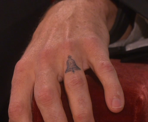Dax found a way to do it different. Instead of a ring, he has a “bell” tattooed on his finger. Because, ya know, Kristen BELL. Within the tattoo are the letter K, D, and L : Kristen, Dax, and Lincoln (their daughter). (He starts talking about this around 0:35 of the video.)