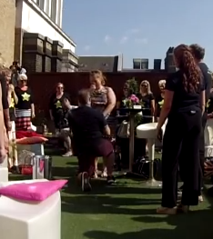 Darren told Leann they were just going to a special rooftop bar for a quiet drink. If you call renting an exclusive space in London and filling it with 70 singers “quiet”, then I guess she wasn’t very surprised.