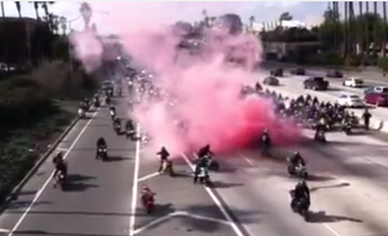 As the video starts, you see a few people stopped and waiting ahead of the massive biker pack. All of a sudden, you see the bikers slowing to a crawl underneath an overpass where the couple’s family members had gathered to film the proposal. Hector’s wheel begins to emit a cloud of pink smoke, and then he gets off his motorcycle to pop the question.