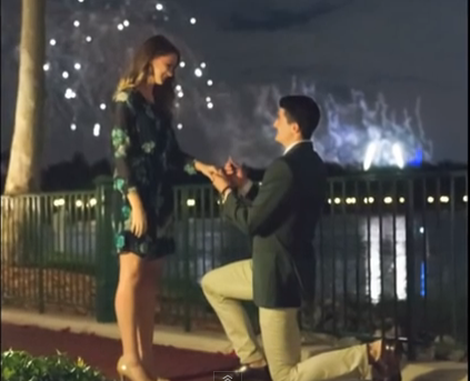 When the fireworks begin, she opens to gift that turns out to be a book Ben made her titled, “The Greatest Fairytale Ever Told”. In it is a story accompanied by pictures that Ben put together about their relationship. The last page reads, “Will You Marry Me?” On cue, Ben drops to one knee and proposes amidst the fireworks lighting up the sky (5:30 of the video).