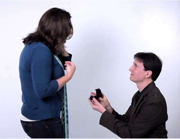 Around 5:05 David starts joking about how it’s about time they did, ya know, do that thing. Natalie laughs at him and makes a “ball and chain” joke, until he reaches into his pocket and kneels. She’s then aware just how much he meant it.