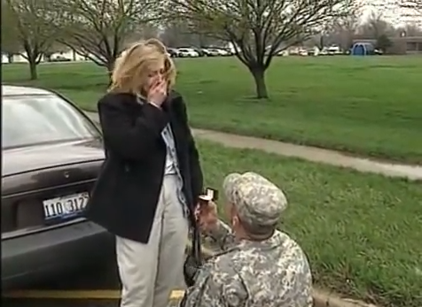 As she’s pulled over for a traffic stop and asked to get out of her vehicle, she had no idea that Chad would be walking up behind her. But then, around 1:10, he plays their favorite song on a CD player as he approaches her.