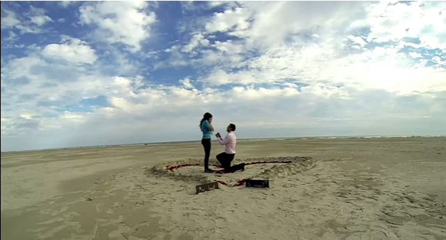 Miguel and Lorena walk arm in arm down this walkway he’s set up with signs that say things like, “I love you”. Finally they go to the middle of this heart he has created in the sand, and he drops to one knee (1:40).