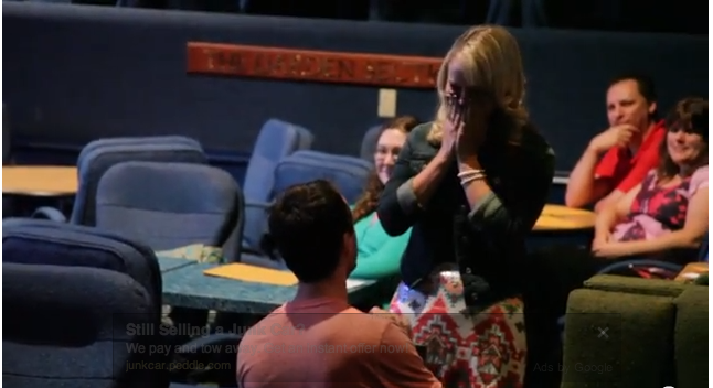 Around 6:10 of the video, after David and Lauren have both auditioned and David has already gotten a “no”, David comes on stage (much to everyone’s surprise) and pops the question to Lauren.