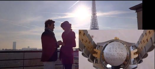 After a romantic evening consisting of dinner, champagne, chocolates, and a private terrace with a view of the Eiffel Tower, Max woke Katy up with an “early Christmas present”. A Rolex watch? Well, when he took her outside for pictures and showed her the back of the watch, she was in for a surprise.