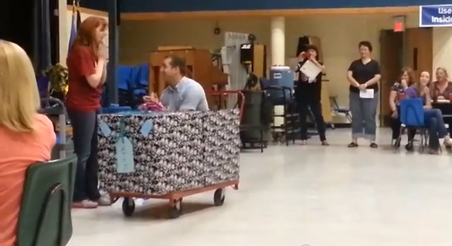 This man put together a “movie trailer” that looks like it’s being shown at a church or some kind of event center. He films his girlfriend throughout the entire thing, and it finally gets to a point when she realizes that the “preview” is actually their story (around 1:47).