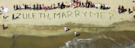 He takes his bride-to-be up in a helicopter and flies over the beaches of California– instantly romantic, right? It gets even better when he points out that the beach below them is where he first asked her to be his girlfriend. As if that’s not sweet enough, when she looks out the window, there’s huge letters spelled out in the sand, asking her to marry him.