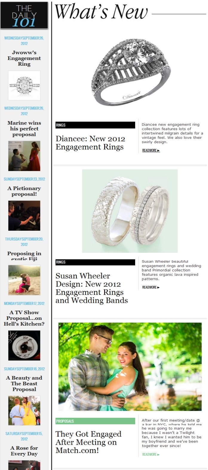 From now on, it’s easy to spot what’s new online. Find the newest real proposal story or the latest engagement ring collection in one click, and get a sense of all our beautiful content in a glance. Our “What’s new” section will lead you to our latest proposal tips, real proposal stories and engagement ring news. Read the daily 101 for fun proposal news stories, celebrity engagement rings and more.