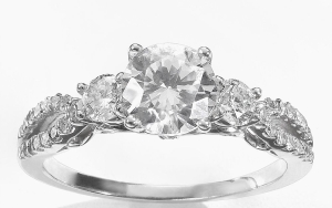 The initial bridal collection includes engagement rings and wedding bands priced from $1,000 to $9,995, before any savings. The jewelry features intricate details and unique cuts for a timeless design. The rings are all 14 karat white gold with certified near colorless diamonds. The engagement ring carat sizes range from 1/4 to 1 1/2 carat total weight.