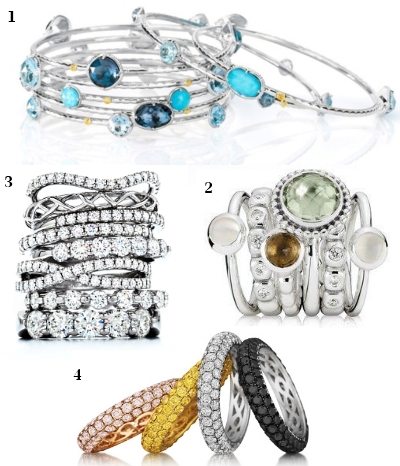 1- Stackable Bracelets. I chose these “Island Rains” bracelets from Tacori as a starting point with a very affordable opening price of $350-$480 for each one, depending on which bracelet you choose. The main point I want to make is that stackable bracelets pack a lot punch! (See the Honora pearl bracelets above as another example.)