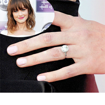 Vintage Styling/Fancy Shape: Vintage movies, TV and vintage clothing have taken Hollywood, and the country, by storm. The vintage trend isn’t unusual in engagement rings either, with celebs like Anna Paquin and Miley Cyrus loving the style. But how do you make a style unique? Well, Alexis Bledel and Vincent Kartheiser found the perfect combination of trends. Their vintage platinum engagement ring showcases detailed and intricate hand chasing. What makes the ring truly unusual is the octagonal cut fancy shape diamond that centers the band. (Photo credit: people.com)