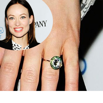 Halo Styling/Color: Were Olivia Wilde and Jason Sudeikis influenced by Natalie Portman’s halo style or Kate Middleton’s vintage gorgeous colored gemstone engagement ring? We may never know for sure. But one thing is for certain. Olivia got the best of both of these popular trends with her yellow gold engagement ring topped by a brilliant round diamond center nestled neatly into a halo of gorgeous green emeralds. (Photo credit: people.com)