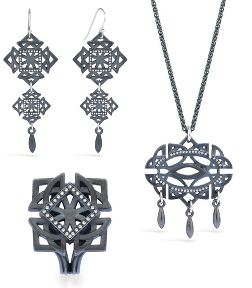 The very popular engagement ring designer MaeVona just introduced two new celtic-inspired silver jewelry collections. The Lauriston collection features oxidised slate silver and starts at $190. It offers black or white diamonds accents options. We love the modern, yet elegant celtic-inspired patterns. The group of bold silver pieces below is from The Celtica Collection.