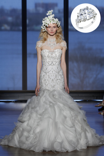 It’s all about couturel embroideries with this stunning Ines di Santo wedding dress, bringing a regal look to this mermaid dress. This elegant Fusaro platinum engagement ring will bring a glamorous touch to the look.