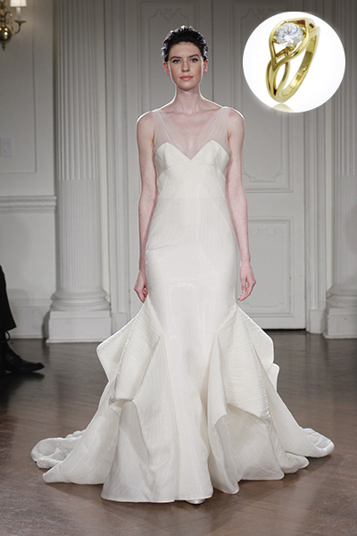 This Peter Langner mermaid wedding dress features modern shapes. The skirt ends like a blooming flower, for a fresh and elegant look. Frederic Sage‘s yellow gold engagement would add a modern twist to it.