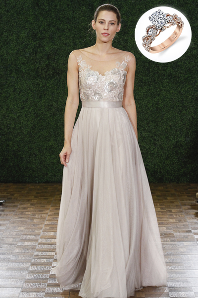 This wedding dress by Watters gives an impression of lightness with delicate floral lace details, for an elegant look with pink hues. To compliment this dress, this Parade Design rose gold solitaire engagement ring with delicate details would be perfect!