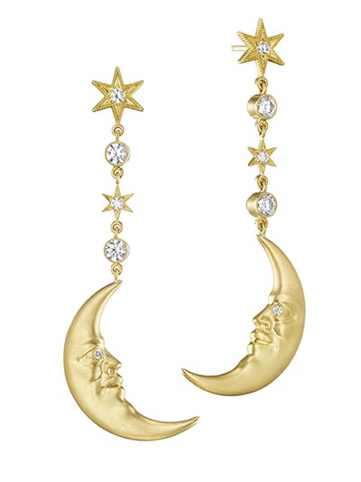 Last but not the least, his yellow gold earrings with moon crescents or sun motifs are just darling.