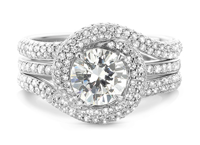 How could I forget? It is my pride and joy! The first ring I ever designed is my engagement ring, which serves as the inspiration for a number of my other designs. Like all of my pieces, it is a stackable set composed by a delicate solitaire with brilliant white diamonds swirling around the center stone.