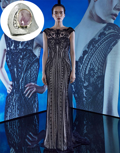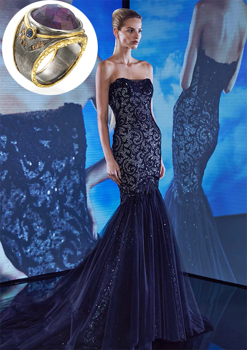 The John Apel Arena collection also includes colorful gemstones such as the purple sapphire above. The smooth design of the ring highlights the beautiful details of this evening dress.
