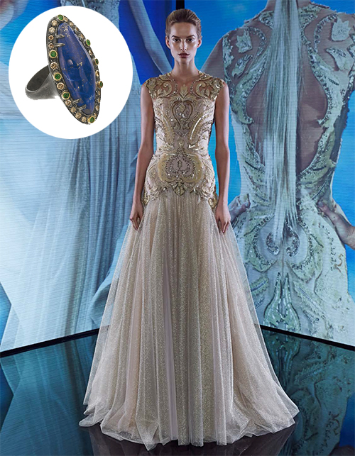 Surrounded with little diamonds and tzavorites, this irregular shaped lapis ring accentuates the contrast between the bold pattern of the top with the ethereal skirt of the gown, for a true baroque look.