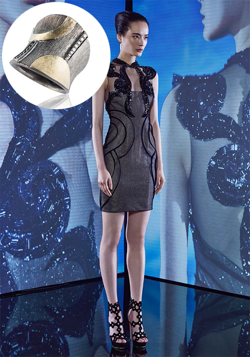 We love the combination of this stunning evening gown collection by Ines di Santo and this selection of bold blackened silver and yellow gold rings by John Apel. The ring above includes delicate rows of black and white diamonds and features textured metal, giving an organic feel to this modern design. It is a perfect match for this elegant short black cocktail dress.