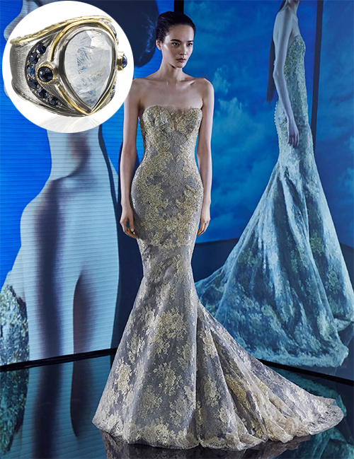 This dreamy pear shaped moonstone ring with yellow gold and sapphire accents is the perfect accessory for this romantic gown adorned with delicate ivory lace.