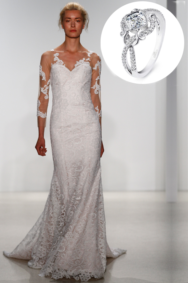 Lace and embroidery details seem to bloom on naked skin this bridal season. Here is a selection of wedding dresses with gorgeous sleeves featuring romantic floral details. We found some great engagement rings to complete the looks. We love the Kelly Faetanini above, with swirly patterns. Add a touch of sparkle with this romantic vintage inspired engagement ring by Parade Design.
