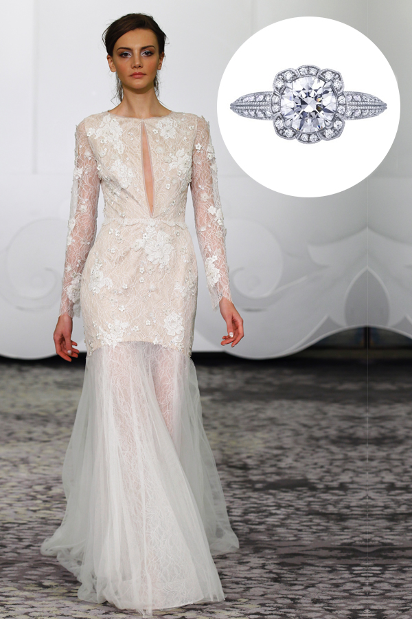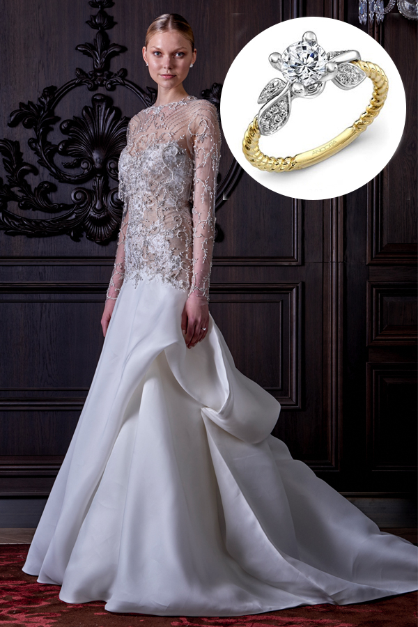 This romantic wedding dress by Monique Lhuillier is the perfect pick for a fairy tale wedding, with intertwined embroidery and sparkly floral details, matching the ones on this engagement ring from by Ancora Design.
