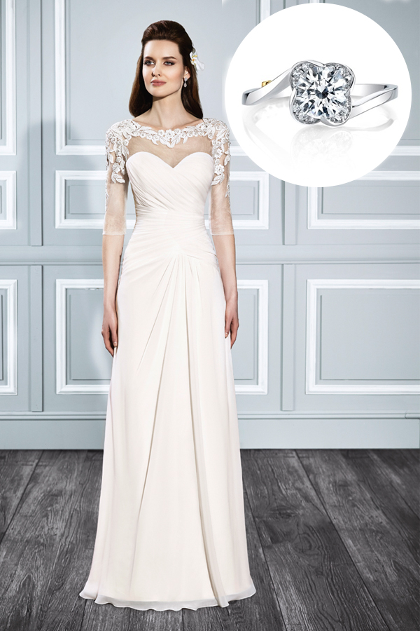 For a vintage look, check out this stunning Moonlight Tango wedding dress, with delicate organic details covering the collar bones and shoulder, framing the upper body. This modern flower shaped Mark Schneider engagement ring matches the sharpness of the lines of the dress, for a uniquely elegant look.