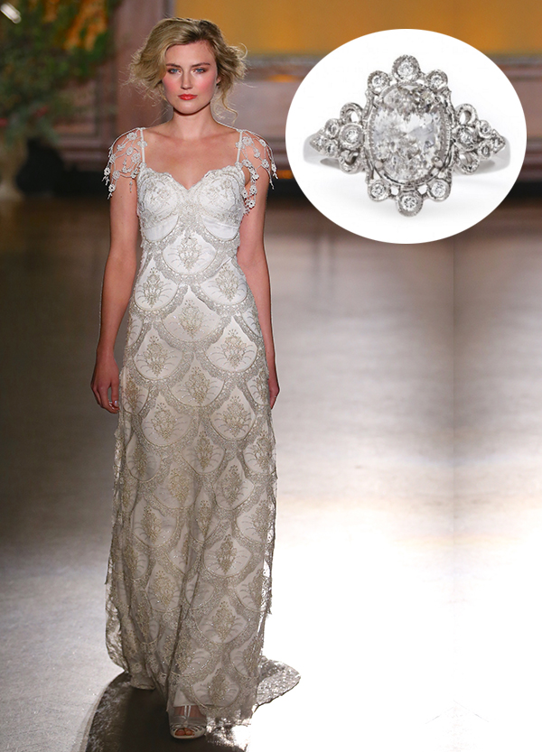 Inspired by lace, the Chantilly engagement ring embodies the grace and luminosity of this most precious heirloom, with a bow like motif, inspired by the delicate details of the collection as seen on the dress above (retails $5,900).