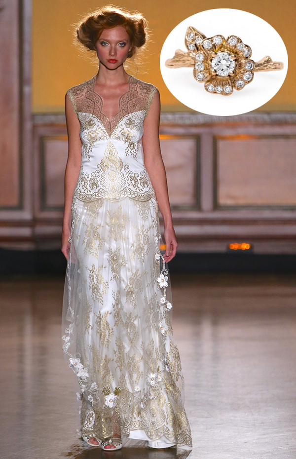 The floral ring above, pictured here in rose gold and named Heart’s Desire truly evoke the grace and elegance of the Rambling Rose (retails $4,250). You can see how the pattern emerged from the details of the Claire Pettibone’s wedding dresses collection.
