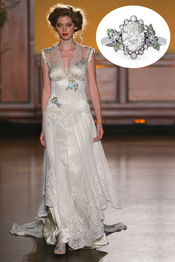 The poetic vision of an eternal love springs forth in the Thalia ring. We love the blue flowers, similar to the ones on this dress and featuring sapphires and tsavorite garnets, for a truly beautiful touch of color. ($17,200)