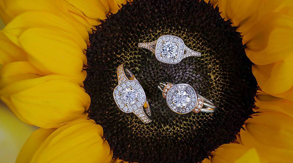 Presented here in the heart of a sunflower , these three halo rings are waiting for you to pick them. We are in love withe the rose gold accents of the round halo and the sophistication of the two cushion halos.