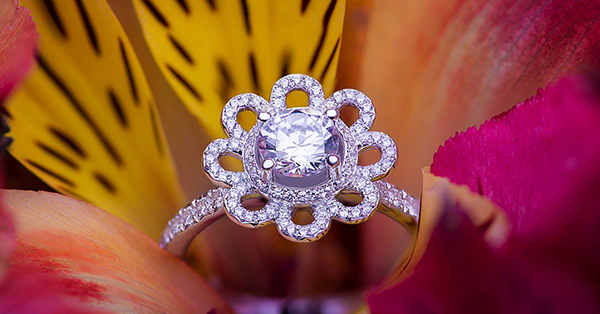 This flower shaped engagement ring is so special and unique, with large petals enhancing the center stone.