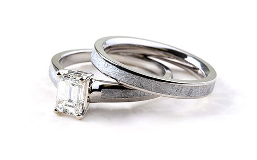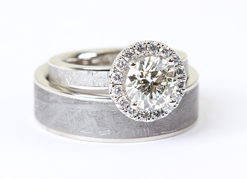 Another very unique material used by Chris Ploof is meteorite. Set with white or yellow gold, it looks amazing as a pick for a band or an engagement ring. Here are some of our favorite styles below.