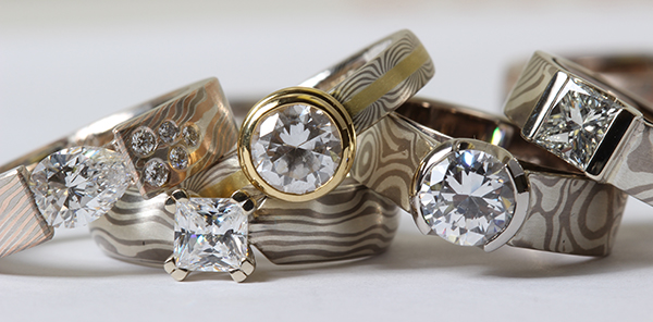 The Chris Ploof Designs engagement ring collection features many alternative engagement rings made out of unusual yet stunning material such as gorgeous Mokume Gane . The rings above have such unique patterns and amazing hues. This ancient Japanese technique bonds numerous layers of precious metals into a single piece, mixing gold, silver, and palladium.