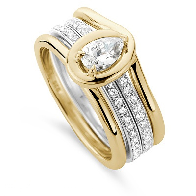 This ring might be the perfect find for a luxurious yet practical ring you can wear no matter what. The pear shaped center stone and the eternity bands tucked in the larger setting gives you a secure fit and a dreamy look.