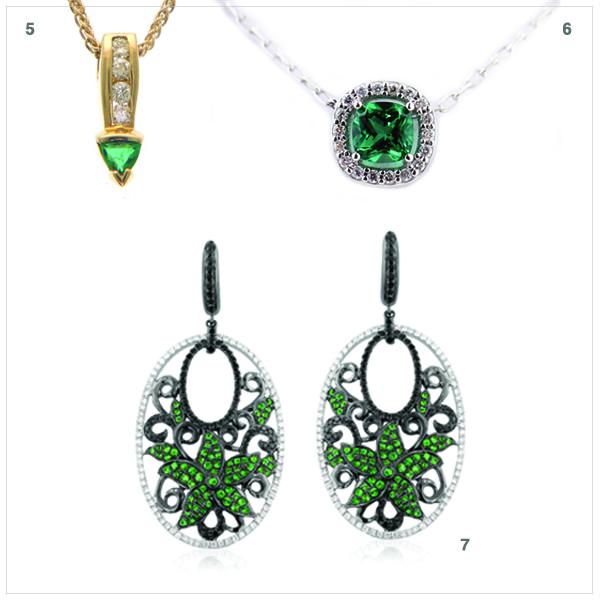 7 – There is an Art Nouveau feel to these stunning tsavorites and black diamonds earrings by Yael Designs. $7,034.