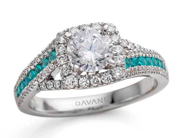 Paraiba tourmalines are really hot this season. I like bright green more than dark green so I adore their unique hue. This engagement ring is designed by Davani. It’s interesting to see how the white gold gives an even brighter glow to the tourmalines in comparison to the yellow gold. As you know yellow is a mix of green and blue so yellow gold tones down the fluorescence a little bit.