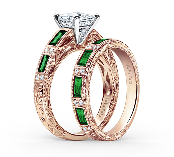 I am totally in love with the rose gold and green combination. This set with tsavorite accents is designed by Kirk Kara. Tsavorite is a green garnet, close in color to the emerald yet more affordable and more sparkly.