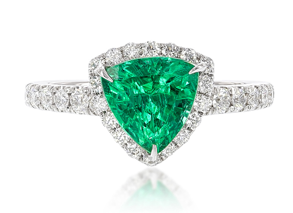 If you want to look at the most amazing emerald jewelry, check out Takat. You might not own yet the millions of dollars needed to purchase one of their Couture sets… No problem, they also offer a beautiful and affordable line of color engagement rings. When it comes to emerald engagement rings, designers often present designs with a traditional emerald cut center. Takat goes beyond the expected with with round, oval, cushion and as pictured here, edgy trillion centers.
